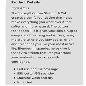 The Jockey® Cotton Stretch Hi Cut creates a comfy foundation that helps make everything you wear over it feel softer and more natural. The cotton fabric feels like it gives your skin a hug at every step, breathing and wicking away moisture to help you stay cooler, drier and fresher as you live your most active life. Blended-in spandex helps give it that extra stretch that lets you attack your workout or workday with confidence.
