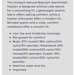 The Jockey® Natural Beauty® Seamfree® Hipster is designed without side seams for a smoothing fit. Lightweight stretch fabric offers lasting comfort, while a hipster silhouette offers a modern fit. Bonded seams and a wide, comfort waistband offer a smooth fit.