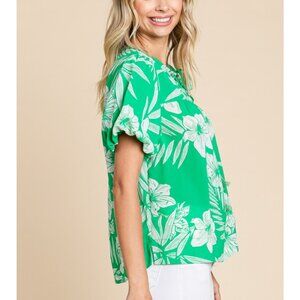 NWT Jodifl Island Vibes Green And White Hawaiian Floral Shirt With Puff Sleeves