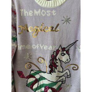 This is a junior's NWT purple Christmas sweater with a unicorn on the front and The Most Magical Time of Year across the front with sequins.