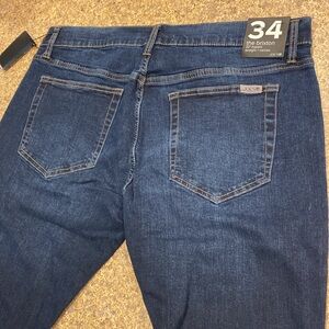 NWT Joe’s Jeans The Brixton Straight + Narrow. Dark Blue. Inventory Pair #2. PLEASE NOTE- ATTACHED TAG SAYS SIZE 34 with 32” Inseam BUT My husband has these and HE FEELS THEY RUN SHORTER than what the tag says and my rough measurements of this pair appear to support that observation THAT THEY RUN SHORTER but you might feel differently so please use my approximate measurements as a rough guide to help determine if you think they will work for you. PLEASE ALSO NOTE: I have 5 Pairs of these available and they all vary in size a bit even though they all say the same size on the tag. Please refer to my approximate measurements in each listing as a help in determining fit. These have a somewhat worn/ distressed look and they seem to also have imperfections from when they were made. My measurements are a very rough approximate and colors may be off because of lighting. They are New With Tags but could have imperfections and color variances, sizing variances and other variances from when they were made.