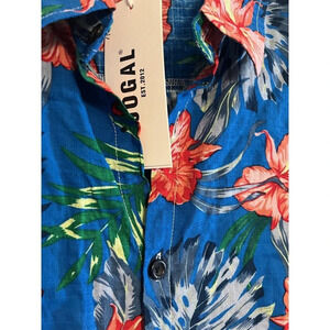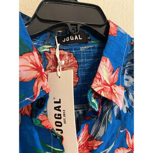 Elevate your vacation wardrobe with this stunning two-piece set from Jogal. The short-sleeved shirt and matching shorts feature a vibrant tropical floral pattern in shades of blue, perfect for a day at the beach or exploring the town. The set is available in size L and is designed for men who want to look stylish and feel comfortable. The brand name Jogal is synonymous with quality and style, and this set is no exception. Add this set to your collection to make a bold fashion statement on your next vacation.