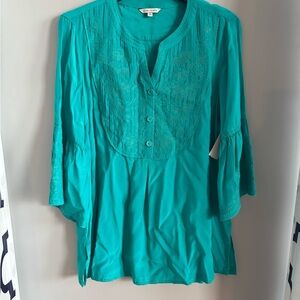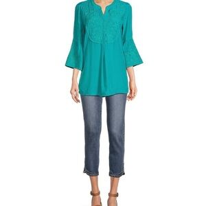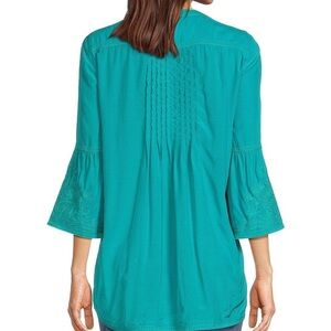 NWT John mark Floral Embroidered Split V- Neck 3/4 Flared Sleeve Pintuck Tunic