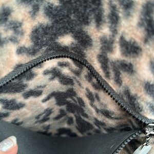 Stylish leopard print pullover with a front zipper. Features a mix of black and tan colors.