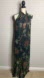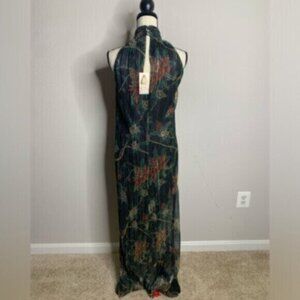 The high-neck, sleeveless style provides a chic and modern silhouette, while the fabric gently hugs the figure, creating a flattering fit. The dress showcases a dark, muted color palette with a delicate floral pattern, adding a touch of femininity and subtle charm. The floral design consists of earthy tones with hints of green, red, and beige, seamlessly blending into the dark background. The high neckline is accented with a scarf-like tie detail, adding an extra element of style and sophistication. The dress falls gracefully to the floor, creating an elongated and elegant look. The fabric has a slight pleated texture, giving the dress a structured yet soft appearance.