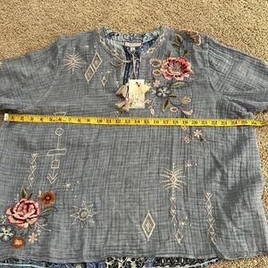 NWT! Johnny Was XL Umoya effortless scarf back embroidered blouse. Front tasseled tie with keyhole, elasticized hem. Gorgeous.
