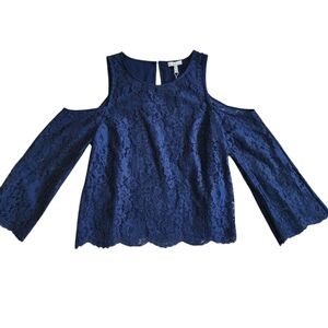 Romantic and effortlessly stylish, this navy blue Joie Abay blouse features intricate floral lace and an on-trend cold shoulder silhouette. The sheer long sleeves and scalloped hemline add a touch of elegance, perfect for dressing up denim or pairing with a sleek skirt.