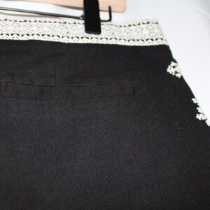 Joie brand chino style shorts in black featuring white embroidery on the side seams, bottom and top hems. Button and clasp interior closure for a seamless front, and no front pockets. One faux pocket in back. Size 6, see measurements below.