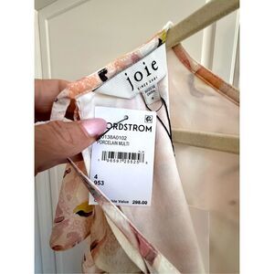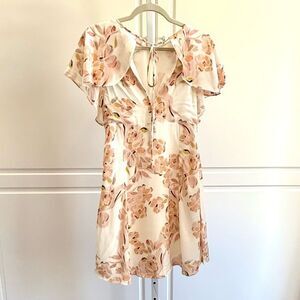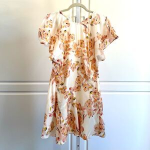 Pretty painterly flowers bloom upon a shift dress that's cut from chiffon fabric and with abbreviated sleeves.