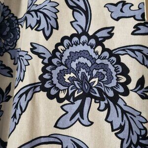 fall around the ankle and color is white with blue and navy floral print!