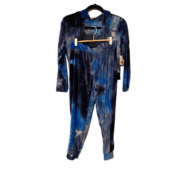 NWT Jolie and Joy YOUTH size Large jacket and pant set blue tie dye pattern. Brand new, never worn, perfect condition. Pants are jogger style, jacket is shorter, could be considered cropped. Long sleeves and zip closure.