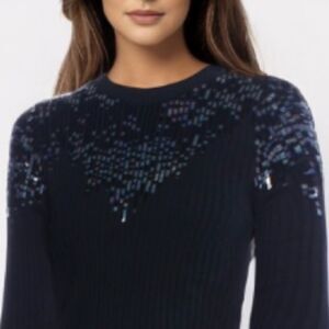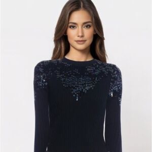 Beautiful black cashmere blend ribbed sweater with sequins details. Perfect for cocktails and leather, or elevate a pair of skinny jeans for date night! This isn’t just for holidays- it will take you to concerts and parties in any day of the cooler months!