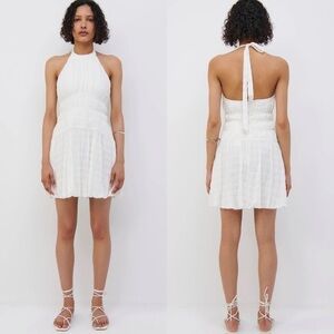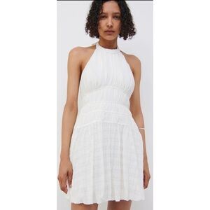 The Bea Gauze Mini Dress in White. Lightweight, textured summer gauze rendered in a mini dress silhouette with tiered ruching across bodice and tie-back halter neckline.
