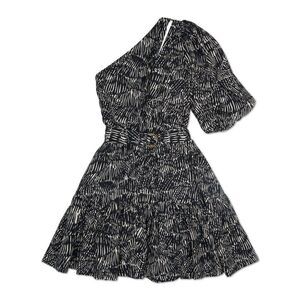 Black and white abstract dress. Ruffle skirt area with an elastic waistband. one shoulder top with a zipper back.