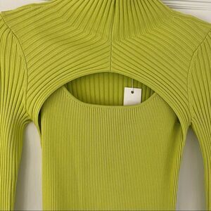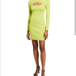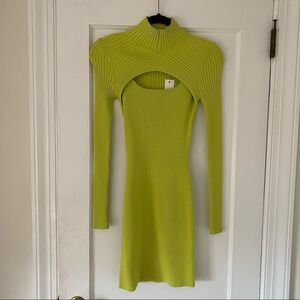 NWT Jonathan Simkhai Corinna Dress. Jonathan Simkhai "Corinna" rib-knit dress features front peek-a-boo cutout. Turtleneck. Long sleeves. Body-conscious silhouette. Hem hits mid-thigh. Pullover style. Color is like a neon yellow/green. Called “citron.”