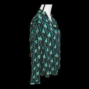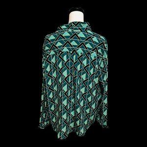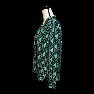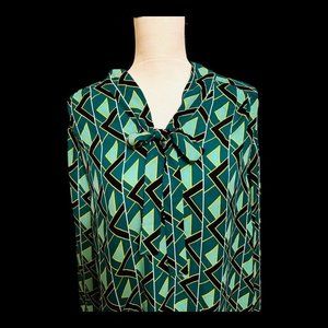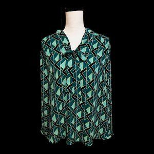 Very pretty and bright feminine blouse. Tie at neck, pleats at shoulders, long sleeves with button cuffs, 100% polyester. Size XL. Ptp-24”