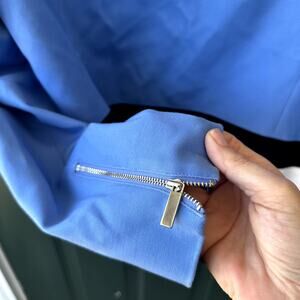 Classic styling with an on-trend detail: this blazer is full zip front with zip cuffs. Super comfortable and breathable stretch fabric: 97% cotton and 3% elastane. Fully lined. Slightly cropped. Pretty medium blue with black and white.