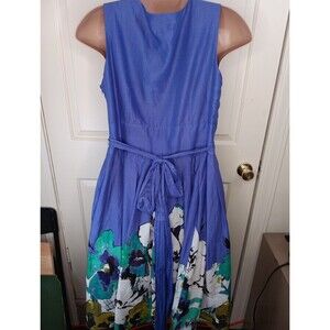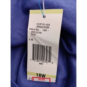 This is a stunning Jones New York Midi Wrap Dress in size 18W. It features a beautiful purple floral pattern on a sleeveless design with a V-neckline and zip closure. The dress is made of 100% cotton material, lined for comfort, and has pleated accents. Perfect for various occasions like travel, weddings, parties, or casual wear in the seasons of summer, fall, and spring.