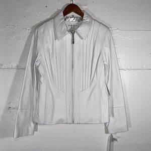 Keywords and Style Keywords: Jones New York leather jacket, womens white leather coat, zip front leather jacket, structured leather blazer, vintage inspired leather jacket, minimalist leather outerwear, classic white leather jacket, elegant leather layering piece, Y2K leather style, retro chic jacket