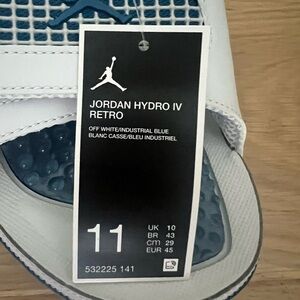 NWT Jordan Hydro IV Retro sandals in Off White/Industrial Blue, size 11. Comfortable and perfect for casual wear.