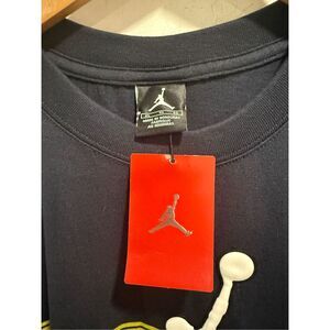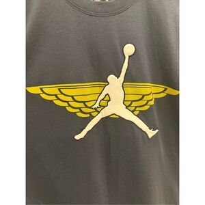 Brand new with tags (NWT) Jordan men’s t-shirt in size XL. This standout black tee features a plush white velour Jumpman logo front and center, layered over bold yellow Wings graphics for an elevated, textured look. A smaller Wings patch also accents the left sleeve. Perfect for fans of retro Jordan style with a modern twist.