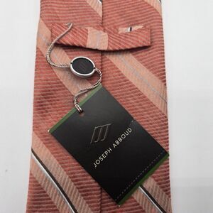 New with tags Joseph Abboud silk tie, made in Italy and crafted from fine woven silk. Features a sophisticated terracotta base with subtle rose and ivory stripes in a diagonal herringbone texture. A perfect balance of modern and classic, this tie transitions effortlessly from business wear to special occasions. Premium Italian construction provides a smooth drape and refined finish. Ties are rolled and placed in plastic bags and shipped in bubble mailers for protection. Wrinkles may form in shipping, and ironing may be required upon receipt.