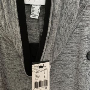 This Joseph Ribkoff top is a silver shimmery gray with black button detail. It is very light weight and the loose tiered neck has black fabric inside to contrast the gray. The front crosses over each other on a tapered angle and is longer in the back. This item is NWT and is size 8.