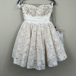 NWT Jovani Floral Faux Pearl Beaded Guipure Lace Mini Dress Wedding Prom Sz 0