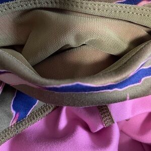 Printed olive green. Cross over high waisted band. Waist pocket.