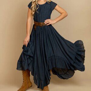 Make her feel effortlessly elegant in this boho maxi dress, perfect for your girls' wardrobe. Featuring short capped sleeves and a high-low hem with gathered ruffles, this dress offers a stylish, twirl-worthy design. The smocked waist ensures a comfortable and flattering fit, while the lace trim and tie at the back neckline add charming details. Crafted for special occasions or casual outings, this dress pairs beauty with comfort. Add this timeless boho maxi dress to her wardrobe for an enchanting look she'll love!