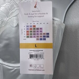 The NWT Joyspun Sexy Satin Lace Unlined Cups Underwire Bustier in White, size Large, is a high support level corset top with a hook & eye closure and bra strap style. Made from nylon and spandex with a satin fabric type, this bustier features lace accents and a boned design. It is suitable for various occasions such as princess, angel, gothic, wedding, and more, offering a semi-sheer opacity and demi cup coverage. Perfect for adding a touch of elegance and style to any outfit, this bustier by Joyspun is a must-have for any woman's wardrobe.