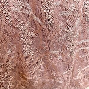 -side slit, square neck, embroidered lace design, sequin accents, left slit at him