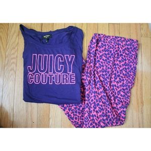 This set is part of the Juicy Couture - Black Label Sleepwear Collection. Short sleeve pajama top with bold logo pink outline lettering. The pajama pant is cute with pink and blueish-violet leopard print.