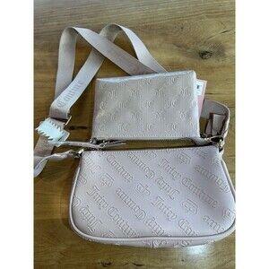 Elevate your style with the Juicy Double Trouble Crossbody in Dusty Blush. This beautiful handbag features an embossed logo pattern on faux leather, with a zip closure and gold hardware. The small size is perfect for your essentials, and the iconic Juicy Double style is sure to turn heads.