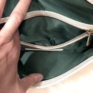 Interior features a beautiful emerald green satin lining, main compartment & zippered wall pocket