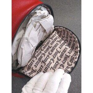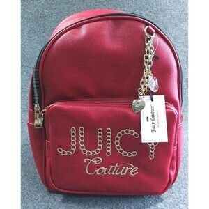 The NWT Juicy Couture Lime Light Backpack in Chili Red is a stylish medium-sized backpack perfect for women on the go. Made of faux leather with gold-tone hardware accents, this backpack features a solid red exterior with adjustable straps for added comfort. The nylon lining adds durability, while the zip closure ensures your belongings are secure. Complete with bag charms and the Juicy Couture logo, this backpack is a chic and practical accessory for everyday use.