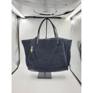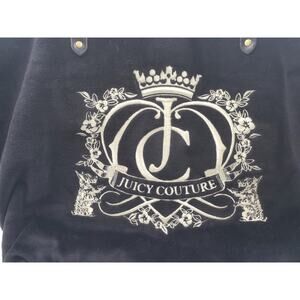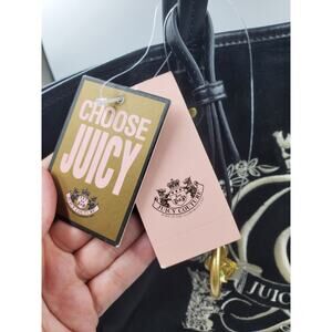 Add a touch of Y2K flair to your look with this NWT Juicy Couture Scottie Emblem Tote! This black velour tote features a luxurious leather trim and a charming gold bag charm. The magnetic closure keeps your belongings secure while adding a touch of mcbling style.