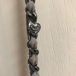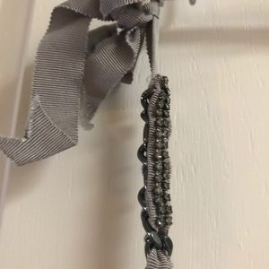 Charcoal grey ribbon is woven into this gunmetal chain link necklace