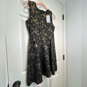Elegant sleeveless dress with a sparkling gold floral-esque pattern on a black background. Extremely lightweight, comfortable fabric. Keyhole detail on back with button closure. Perfect for special occasions and looks amazing shining in the light. NWT never before worn!