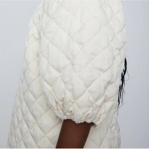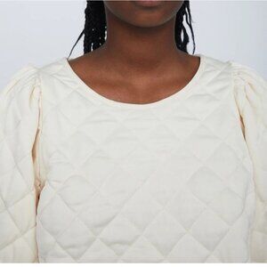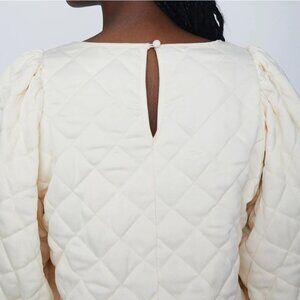 UST female, blouse made from a quilted recycled polyester blend. It has a high rounded neck with a slit and button in the back, ¾ sleeves with gatherings at the shoulder and elastic cuff creating volume, and a boxy fir with inseams by the chest.