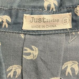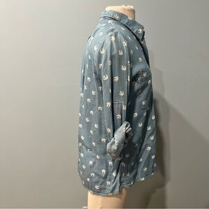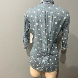 NWT Just Living Blue Tencel Chambray Bird Print Roll Tab Long Sleeve Blouse Sml