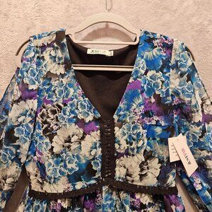 NWT JustFab Dress Womens XS Floral Bright Colorful Side Zip Black Lace Hi Lo Hem