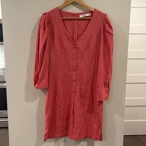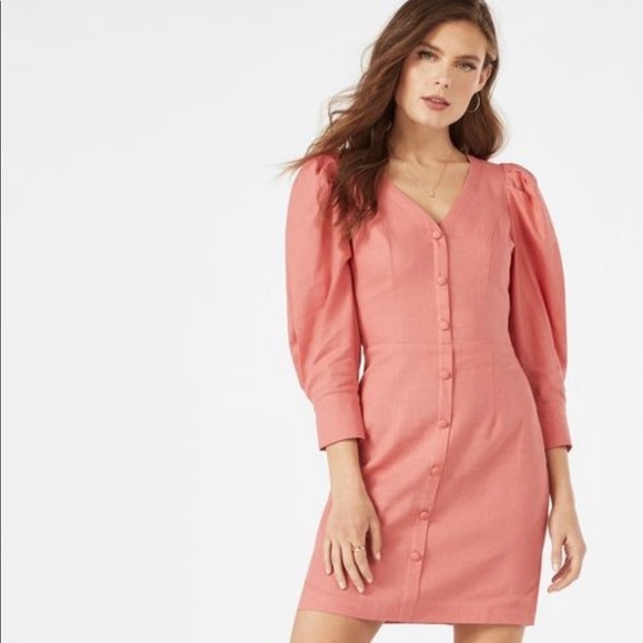 NWT Justfab Dress Women Size Medium Pink Mini Fade Rose Linen Puff Sleeve V-Neck