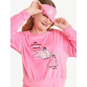 Deck the halls and get into the holiday spirit in this amazing 3-piece pajama sets from Justice! The 3-piece sleep set includes a long sleeve top, a jogger pant, and a coordinating sleep eye mask. The long sleeve top features drop shoulders and a graphic print on the front of the top. The jogger pant features an elastic waistband for extra comfort and stylish graphic prints. The 3-piece set is made of a soft polyester fleece that will keep her cozy and warm and is machine washable. The eye mask has a matching pattern to complete the look and seal the deal on this ensemble!