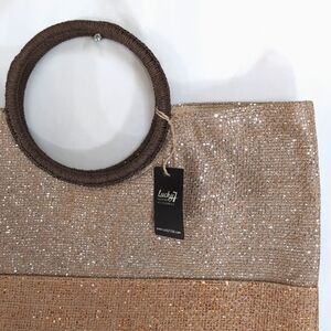 NWT Jute Lucky 7 Gold Glitter Bling Tote / Beach Bag / Travel Bag Round Handles