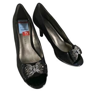 From Karen Scott are these fabulous heels in black vegan suede microfiber, with an open toe, black patent leather heel, and silver & black bow tie detail! The "Bella" model! 3.25" heel, Size 7.5M, Brand New! ***NEW WITH TAGS, and Guaranteed Superb by Lily @HauteClub!* *Measurements always available on request!*