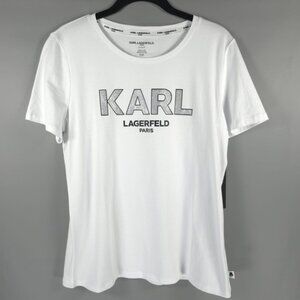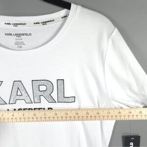 NWT KARL LAGERFELD Embellished LOGO White Silver T-Shirt Style L4XHA070 SMALL