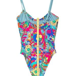 Vibrant one-piece swimsuit with a floral pattern. Features a mix of blue, pink, and green colors.