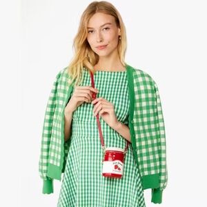 KATE SPADE STRAWBERRY JAM HANDBAG. NEW WITH TAG. LEATHER WITH TWO WAY SCRIPT LOGO LINING. STRAP IS APPROXIMATELY 23". METAL PINMOUNT WITH KATE SPADE LOGO. ZIPPER TOP. NO DUSTBAG.