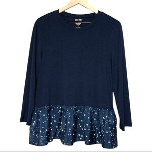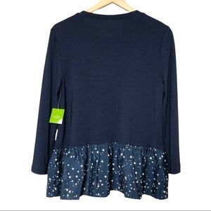 New with tags from Kate Spade Broome Street. 3/4 length sleeves. Dark navy blue top. Ruffle tier peplum in navy and white star design. Round crew neck. Loose fit silhouette. Approximate measurements: 36” chest, 25” length. Women’s size medium.